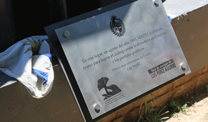 La colocación de la placa surgió por iniciativa de la Red de Amigos de Luis Perez Aguirre para realizar un reconocimiento al Memorial, colocado en el año 2018, como Sitio de Memoria Histórica del Pasado Reciente. En este contexto, la Comisión Nacional Honoraria de Sitios de Memoria resolvió, desde sus competencias establecidas dentro de la Ley 19.641, declarar como Sitio de Memoria el memorial de Ayuno Servicio de Paz y Justicia 1983, ubicado frente a donde se encontraba la sede central, sobre la Av. Gral. Flores 4050.